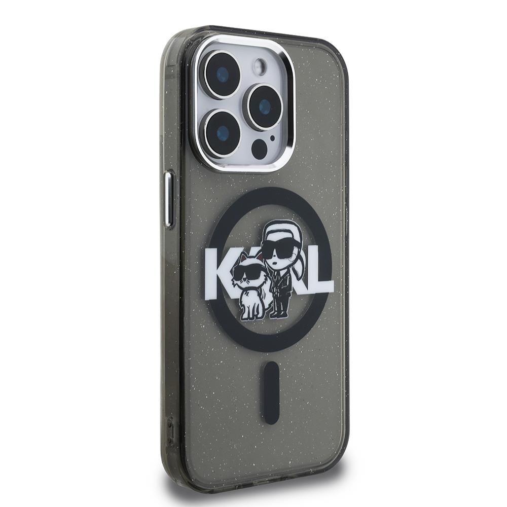 Apple iPhone 15 Pro Max Kılıf Karl Lagerfeld Orjinal Lisanslı Parlayan Simli Karl & Choupette Sketch Logo Kapak