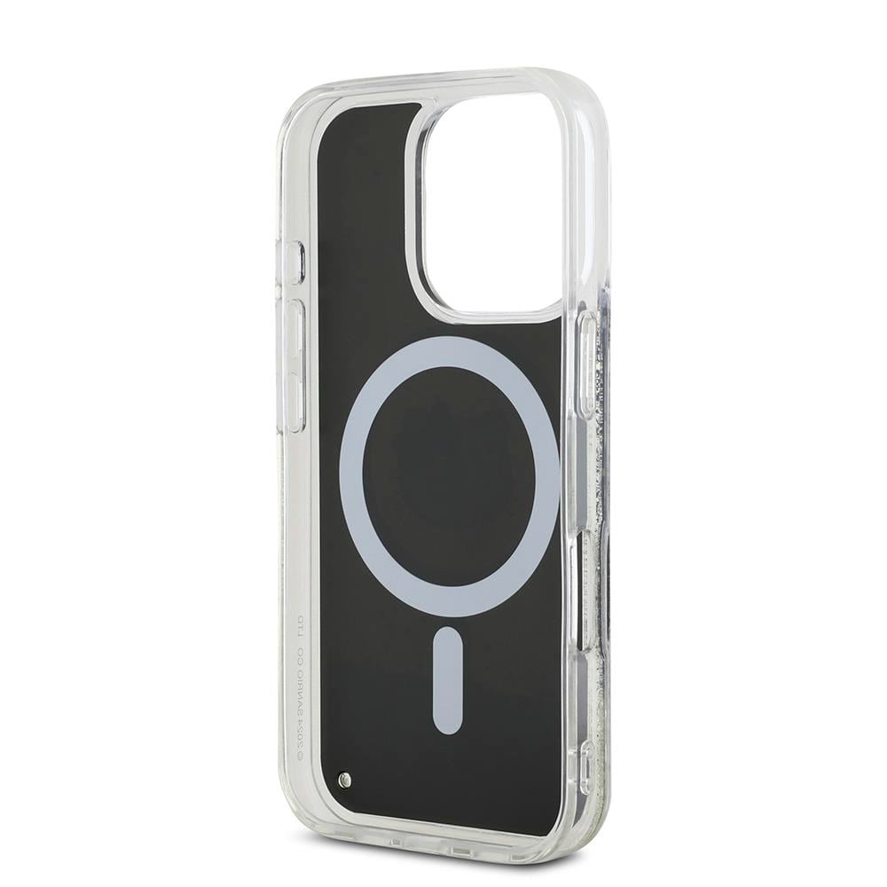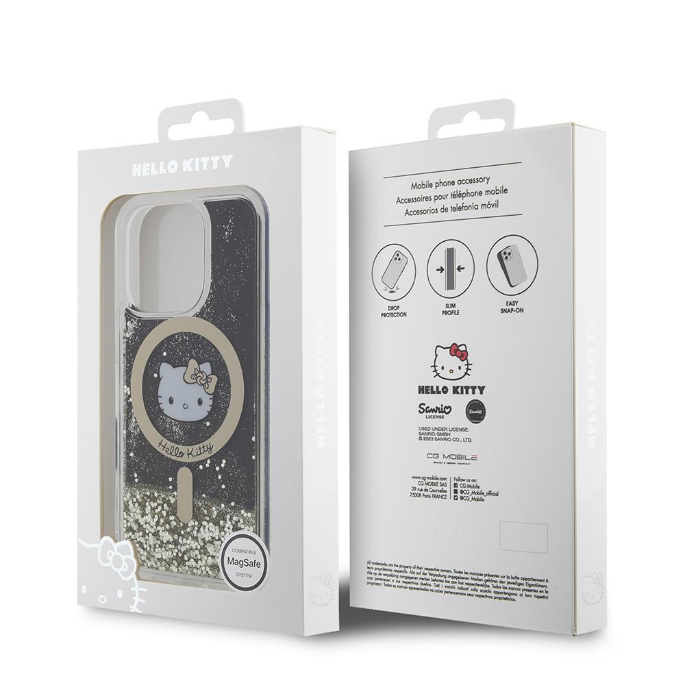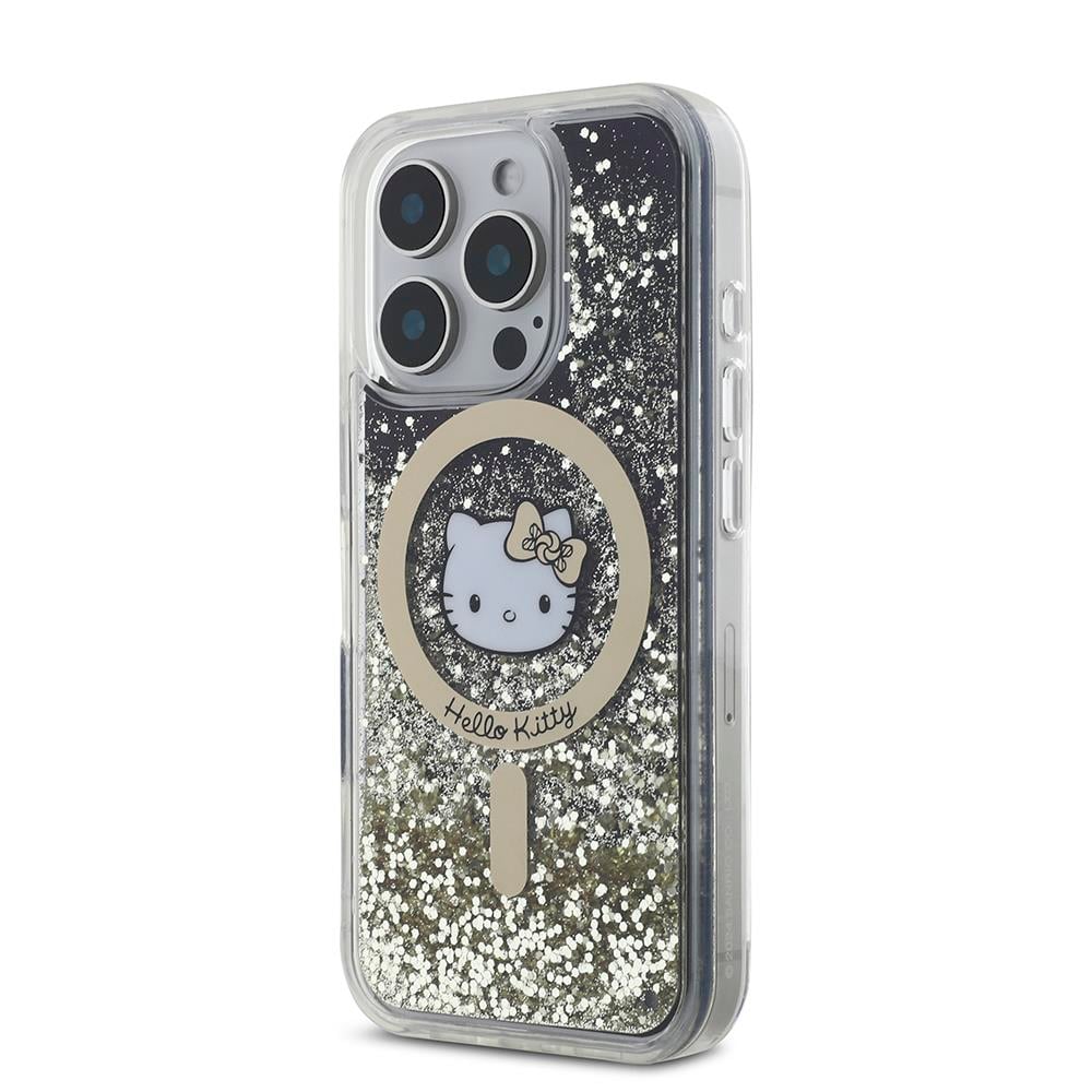 Apple iPhone 16 Pro Kılıf Hello Kitty Orjinal Lisanslı M-safe Şarj Özellikli IML Baskı Kitty Head Logolu Sıvılı Simli Altın Ateşi Kapak