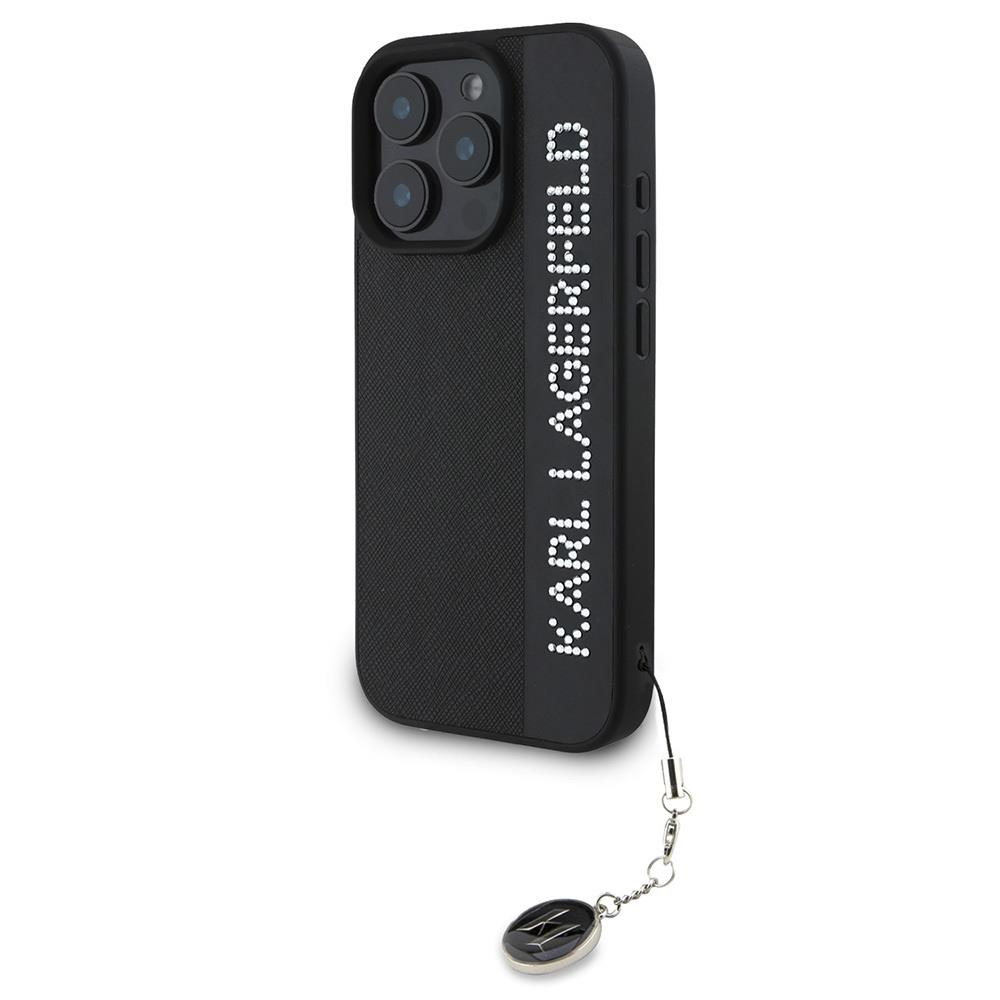 Apple iPhone 16 Pro Kılıf Karl Lagerfeld Orjinal Lisanslı Anahtarlıklı Taşlı KL Yazılı Saffiano Rhinestones Kapak