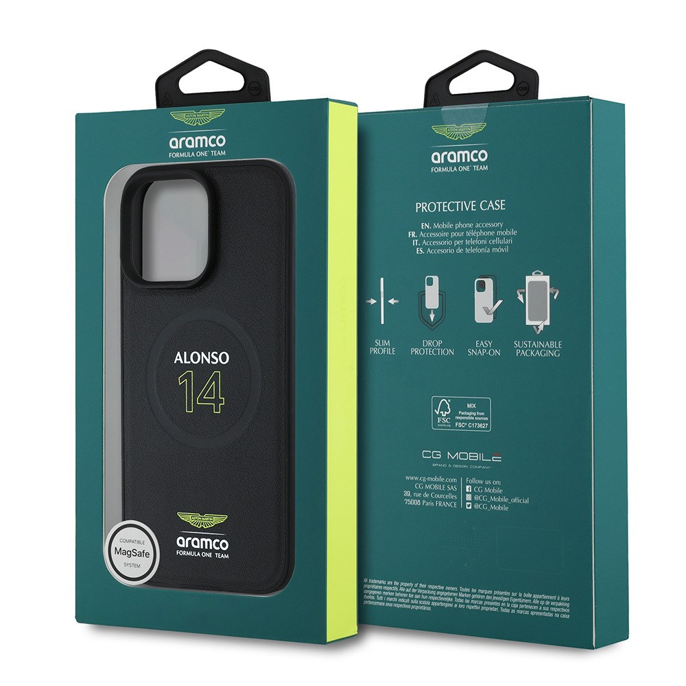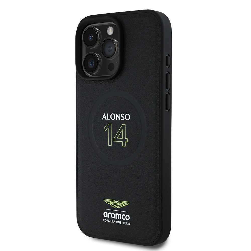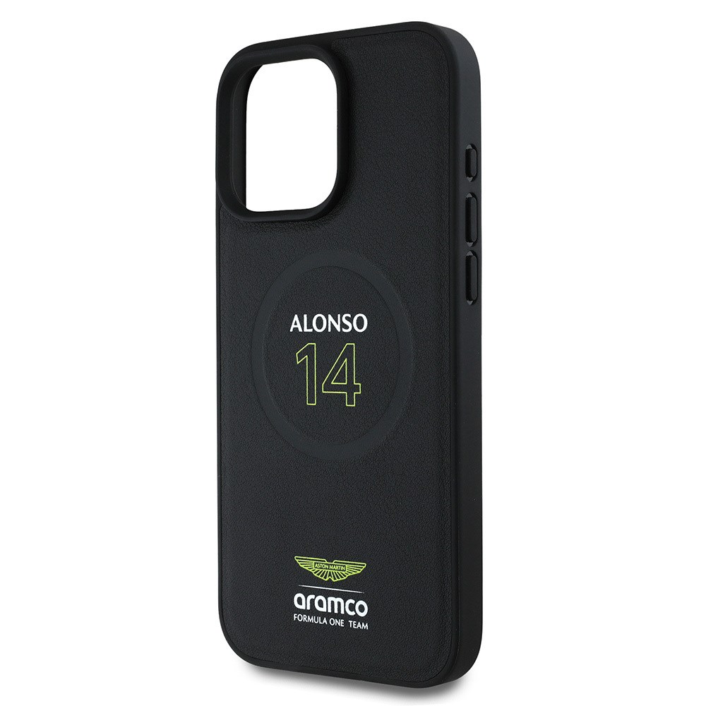 Apple iPhone 16 Pro Max Kılıf Aston Martin Orjinal Lisanslı M-safe Şarj Özellikli PU Deri Alonso 14 Baskılı Kapak