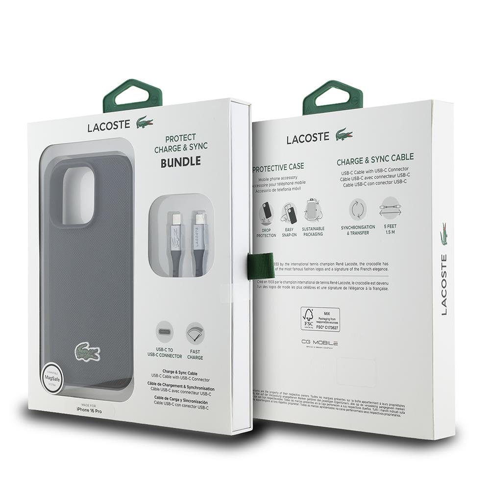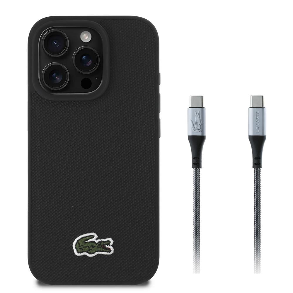 iPhone 16 Pro Max Kılıf Lacoste Orjinal Lisanslı PU Pike Desenli Arka Yüzey İkonik Timsah Dokuma Logolu Kapak + Type-C Kablo 1.5m