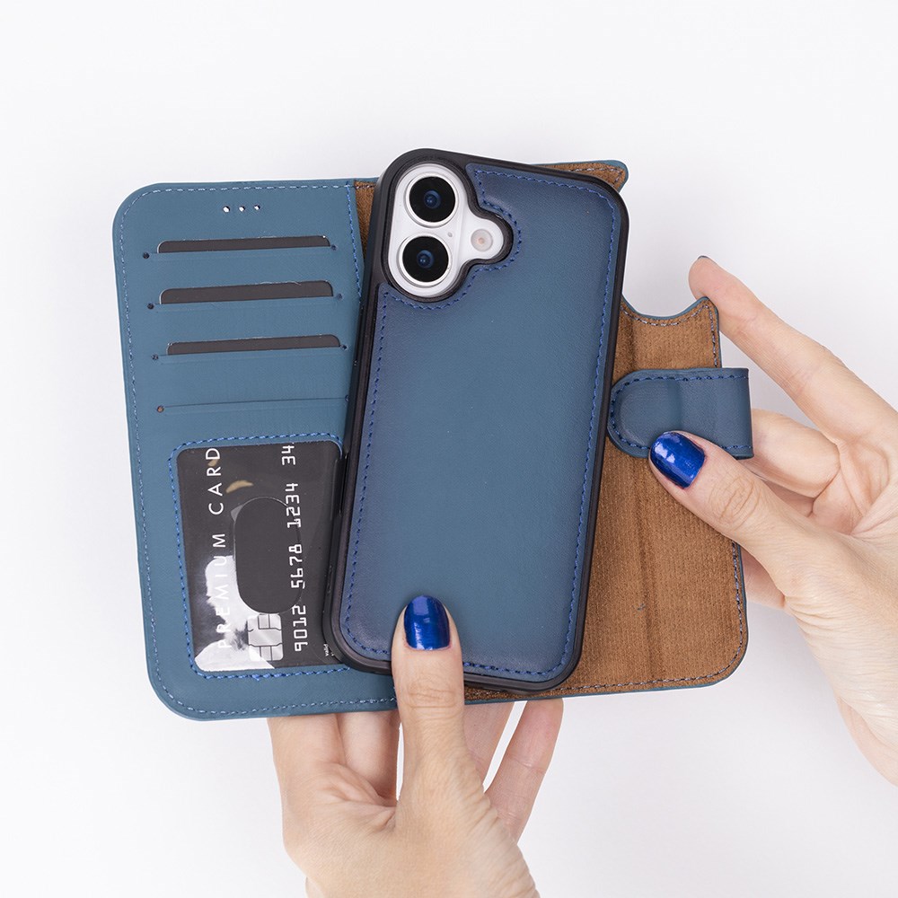 Apple iPhone 17 için, Hakiki Deri, El Yapımı Cüzdanlı Kılıf, Magsafe ile uyumlu, İç Yüzeyi Kadife, Gölgeli Mavi