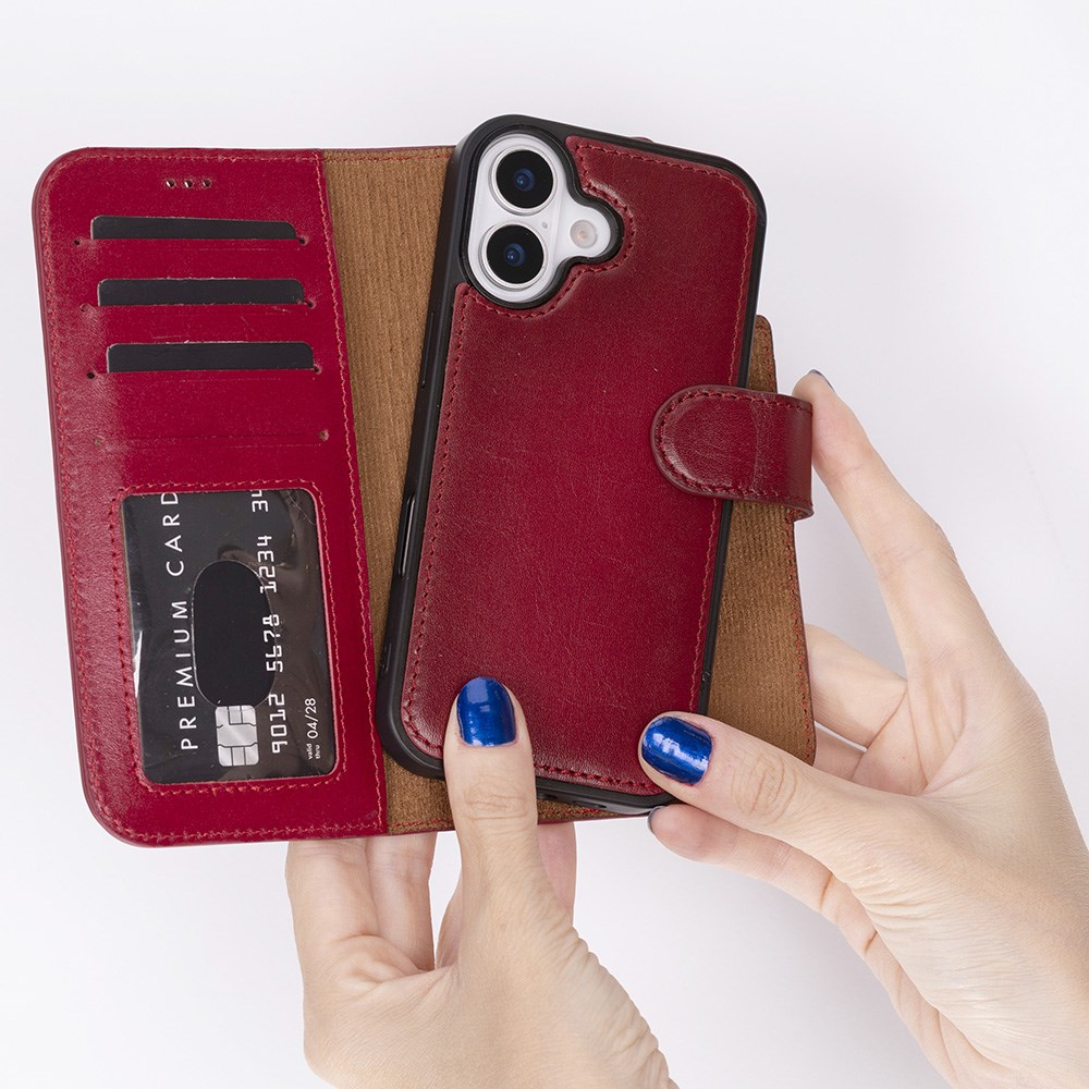 Apple iPhone 17 için, Hakiki Deri, El Yapımı Cüzdanlı Kılıf, Magsafe ile uyumlu, İç Yüzeyi Kadife, Kırmızı