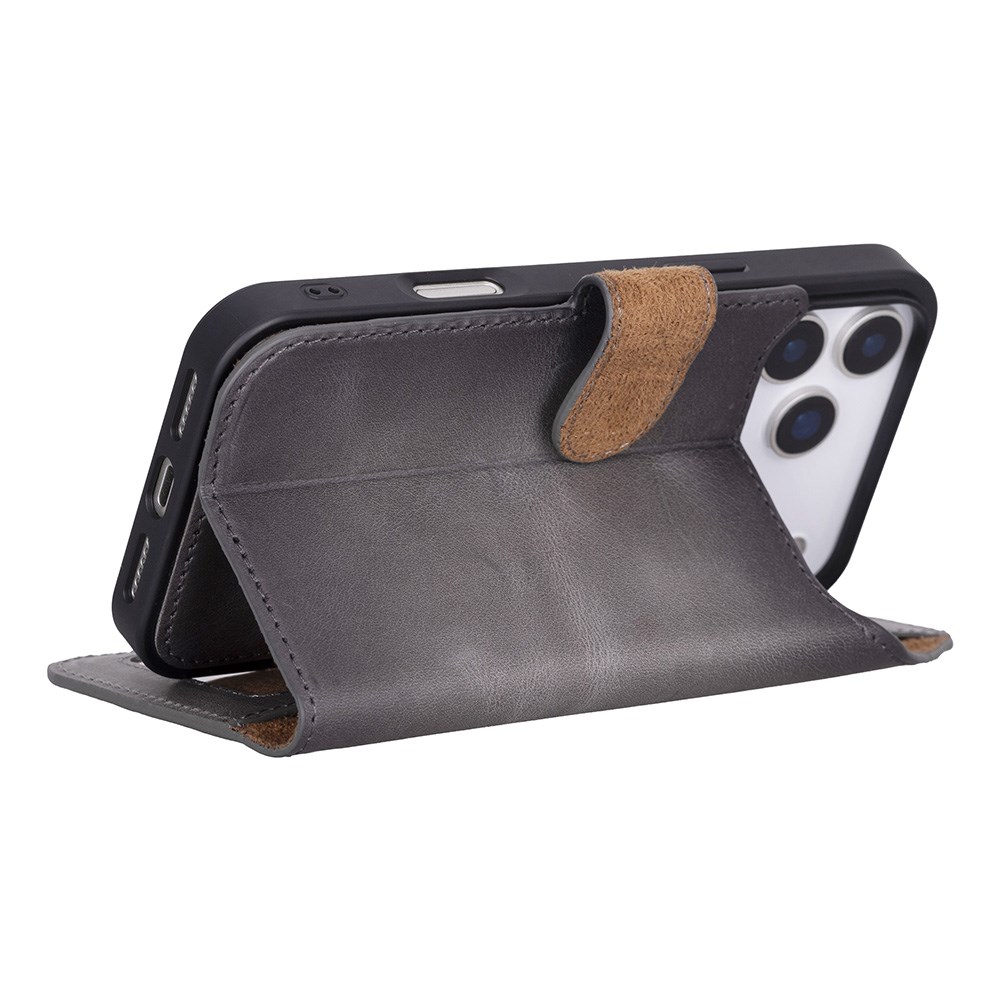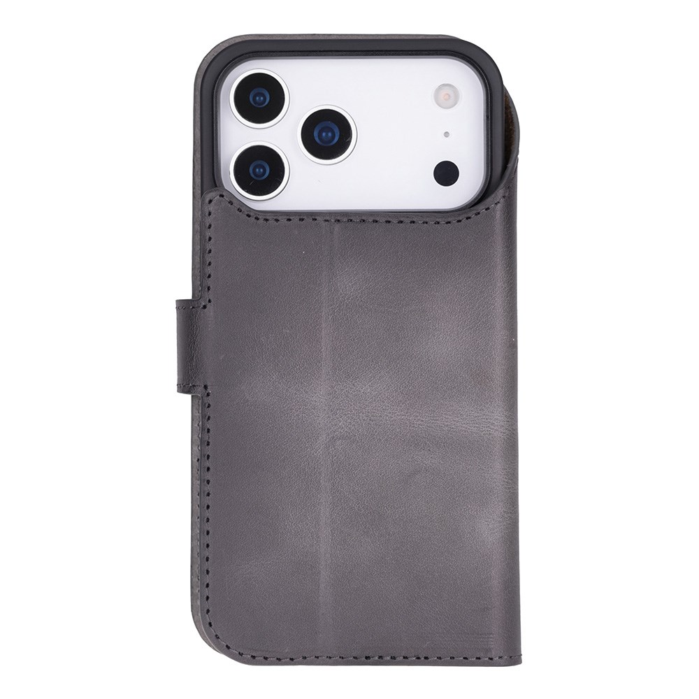 Apple iPhone 17 Pro için, Hakiki Deri, El Yapımı Cüzdanlı Kılıf, Magsafe ile uyumlu, İç Yüzeyi Kadife, Duman Gri