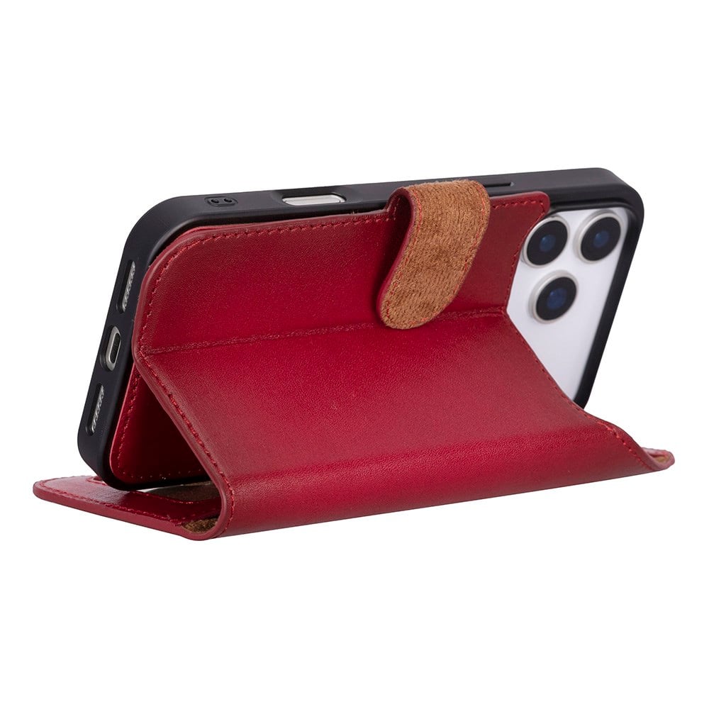 Apple iPhone 17 Pro için, Hakiki Deri, El Yapımı Cüzdanlı Kılıf, Magsafe ile uyumlu, İç Yüzeyi Kadife, Kırmızı