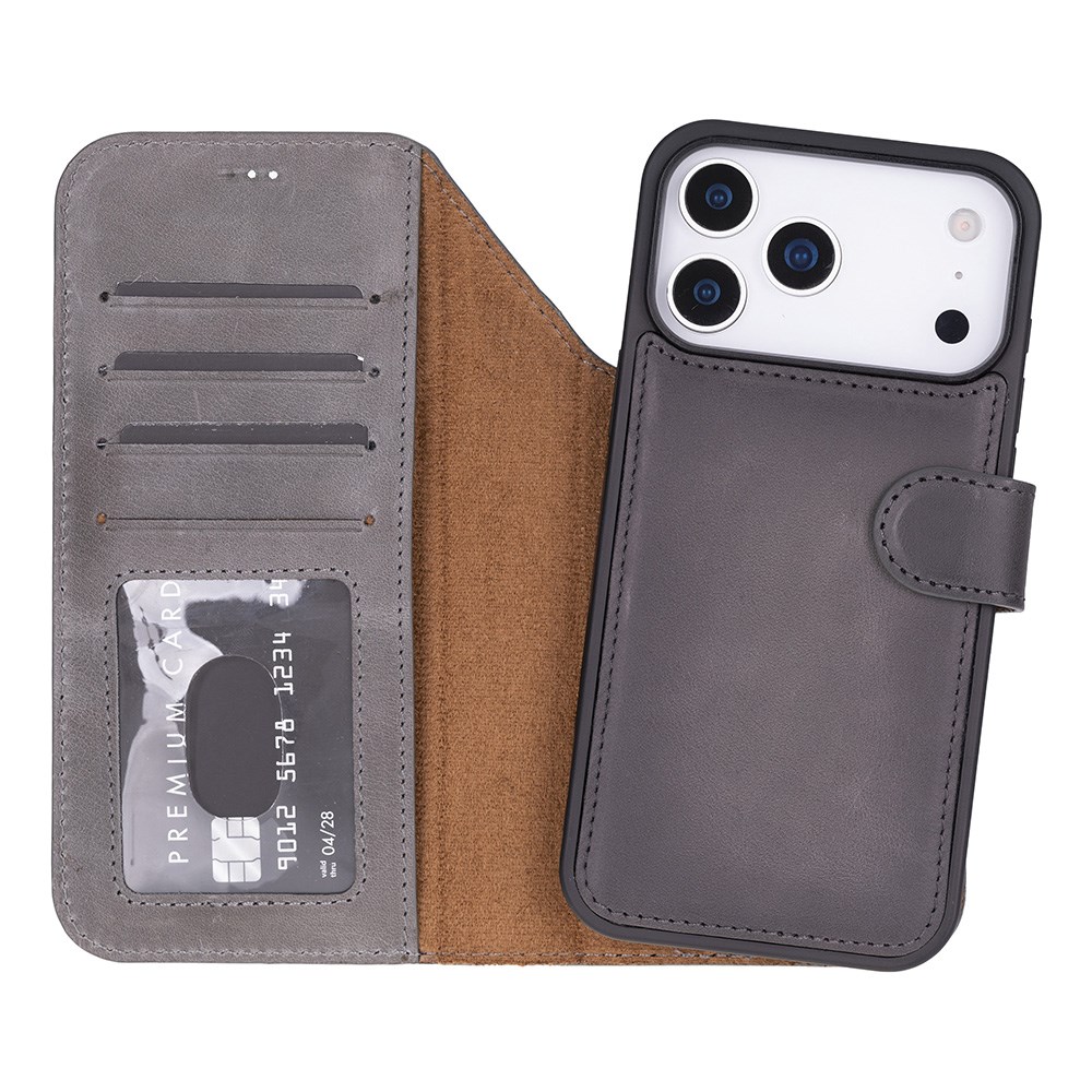 Apple iPhone 17 Pro Max için, Hakiki Deri, El Yapımı Cüzdanlı Kılıf, Magsafe ile uyumlu, İç Yüzeyi Kadife, Duman Gri