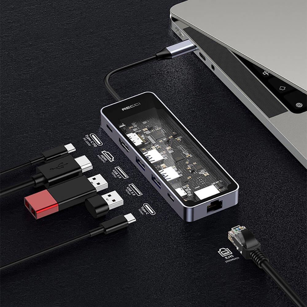 Recci RH17 Type-C to Type-C PD100W + USB3.0 + HDMI + Type-C + RJ45 Bağlantılı 6in1 Hub
