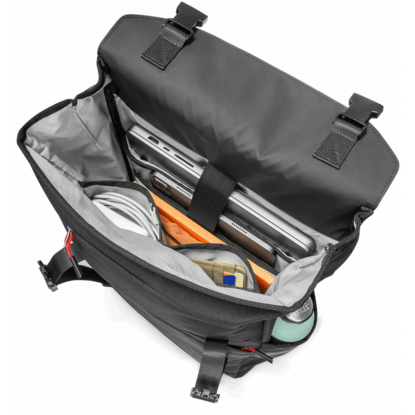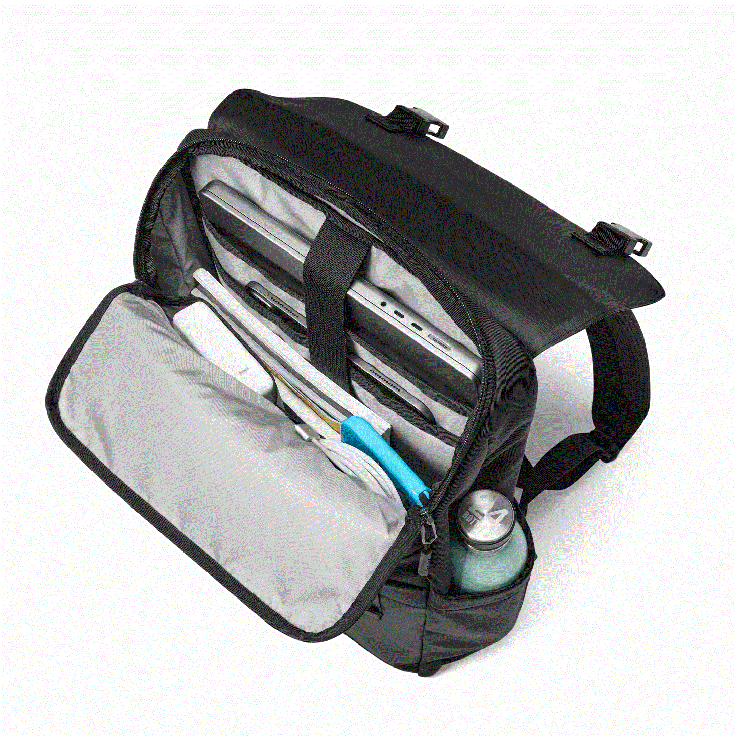 Ön cepte tablet, defter, şarj adaptörü, powerbank, kulaklık ve diğer aksesuarlar için çoklu organizasyon alanları bulunur.